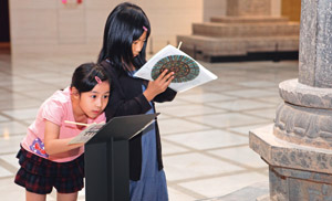 中午,獲獎兒童與老師、家長們於午齋後,在導覽員親切的引領下,進行第一階段的佛教文物導覽。小朋友個個聚精會神專心聆聽,並頻頻舉手發問;當導覽員一一為大眾解說佛菩薩的手印意涵時,學童們興味盎然地模仿佛菩薩的手印,現場洋溢著孩子的笑聲與高昂的學習趣味。