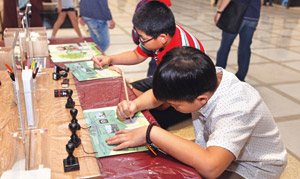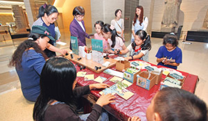 大人與小孩沉浸於製作蓮花明信片的喜悅。