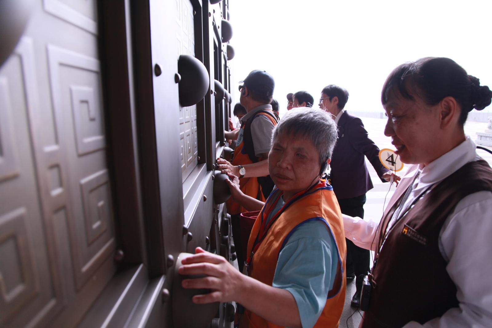而透過「指尖的視覺」,他們感知的視界更是多姿多采!當觸及堅實仿長安古城牆的巨石板磚,彷若正穿越時空,與透出神奇光芒的灰色星球相遇;當觸及厚實的乳釘紋飾銅門,就猶如撫摸著溫暖的棕褐大地;在點選心經牆前,更是興奮地描述,自己好似親臨莊嚴華美的佛國淨土。