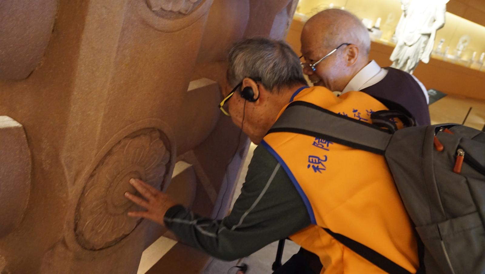 在五感中,聽覺與觸覺是視障朋友重要的認知管道,透過傾聽與觸摸,他們即能進入博物館的特殊情境中。無論是聆聽佛陀八相成道的歷史事蹟,或面對高聳猶如天頂的彩繪玻璃天窗時,他們都很自然地揚起頭來, 如沐浴在慈悲的佛光中,以心印心地向佛陀虔誠合掌。