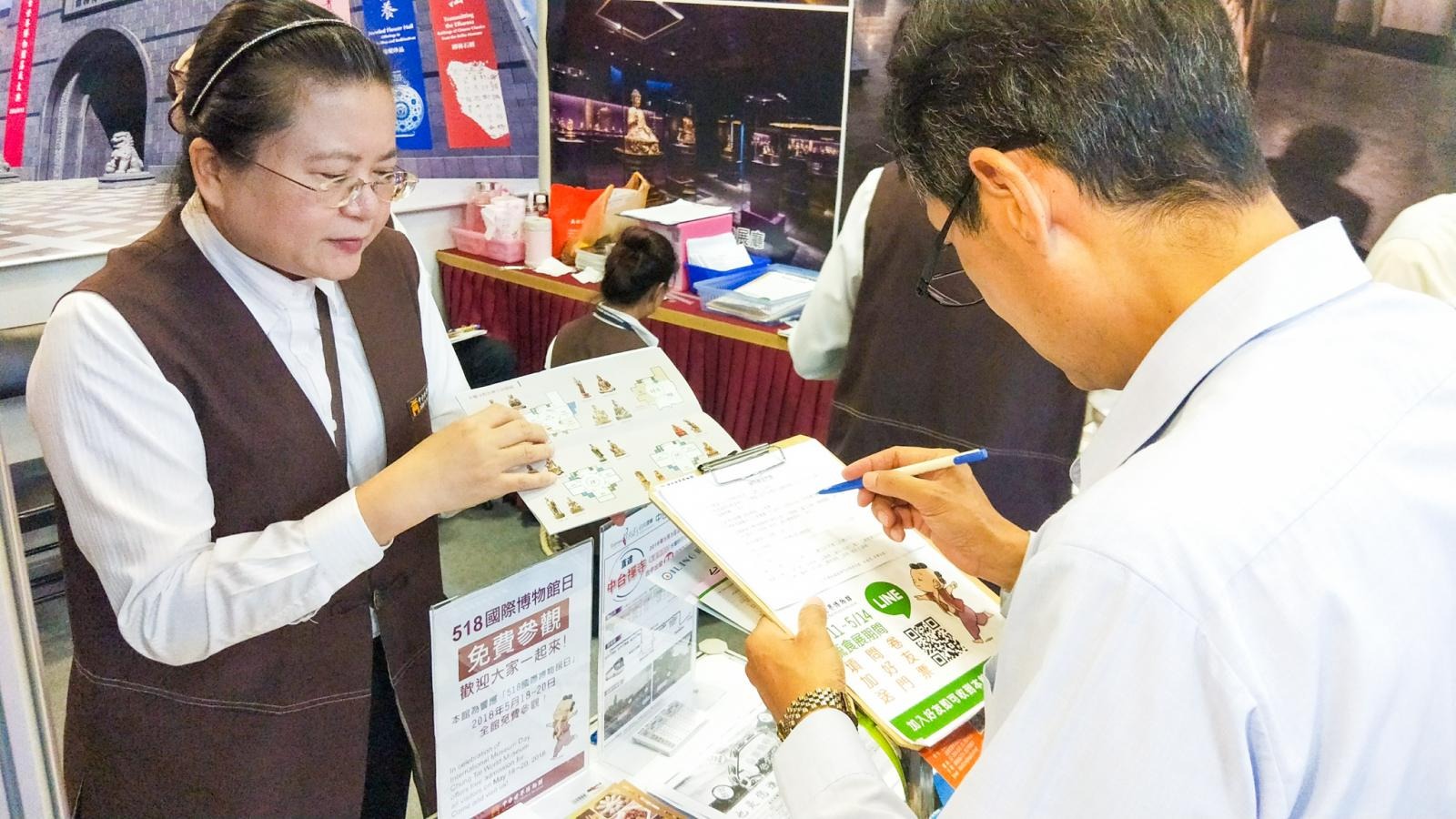 這四天當中,義工彼此鼓勵、分享話術,熱情宣傳博物館。除了攤位接待,義工更主動出擊,身穿褐色背心,化身為活力十足的宣傳大使,走入群眾,邀請遊客填寫問券。義工分享:「看到遊客欣賞展件照片時眼睛發亮,自己頓時明白,這次世貿擺攤最重要的,就是讓博物館能被更多人看見、讓這些珍貴的千年文物有機會呈現在大家眼前。」