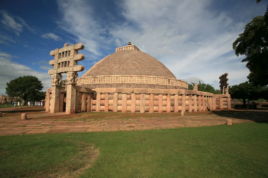 早期の卒塔婆は墓葬の形式から来たので、古代の斎祀の名残を僅かに漂わせている事が分かったが、その形式は比較的簡単である。紀元前二世紀の遺跡の中(サンチーやバルフト)でも早期の卒塔婆仏塔の基本的な形式の仏塔を見学できる。例えば、仏塔の主要な部分を形成する半円形の覆鉢型の塔の建物や、四角の平台や、塔の屋根の頂上にある低い相論部等の小さい建造物等と、それらの建造物がどのように配置されて卒塔婆仏塔を形成しているか、等を観測できる。現在、インド中部のボーパル(Bhopal)の古代都市のサンチー(Sanchi)には、三座の大卒塔婆仏塔が残存しており、豊富な古代の仏教芸術を代表する石柱や納骨壺兼位牌安置堂や僧院等の建物が残っている。考古学者は個々の仏教芸術の創始年代は、マウルヤ王朝が紀元前317年頃に建国された後、アショーカ王時代になってから始まっており、シュンガ王(Shunga)を経て、アンドラ(Andhra)王に至る迄、継続的に修理や建築物が追加されたり新たに建造されたりして来た事を発見した。