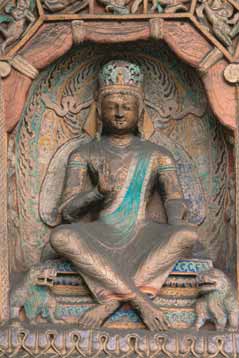 また、四川の麻濠漢の墓の上の額の横梁の上には仏像が配置された「線彫」が施されている。当時、墓の額の横梁は、一般的には、神仙や青龍白虎等の霊獣の絵を描いたり線彫りした空間であるが、それらの像形に換わって、御仏像が配置されて線彫りされたのである。彭山から出土した「揺銭樹」には、本来「西王母」が配置される位置であったものを、仏像に換えて配置されたものである。この様な現象は、インド仏教芸術が、仏教が民衆に伝播されるに従って、中華の土地でインドと中華の相互の造形芸術が融合する過程を顕示している。