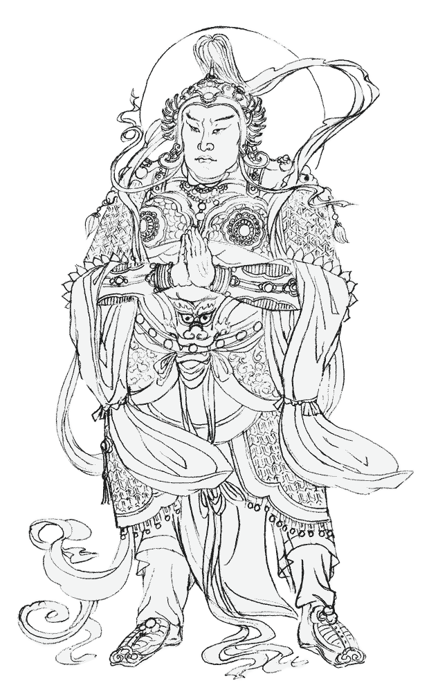 韋馱天は又の名を「韋天将軍」、或いは「韋馱菩薩」の尊称があります。南方の増長天王の八将の一神で、四天王の三十二将中の首位を占める天部の仏心で、僧団(教団)や寺院で最も著名な護法神として祀られています。